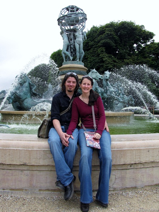 | Sitting in Luxembourg Gardens watching musicians set up for Fête de la Musique. | Kim and I posing together in front of a fountain. |